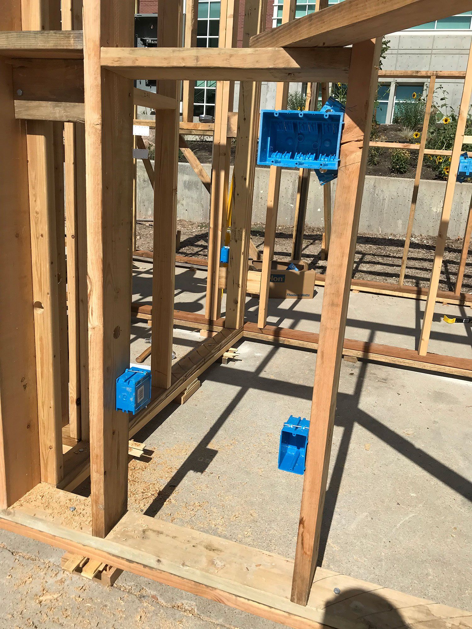 Not just walls went up this week. We also started installing electrical boxes, sheathing, the main structural beam, and working on the furniture. Our structural engineer stopped by again to check in and see the progress on the suggestions she gave us in last week's visit. Everything is coming along great! We also had a visit this week from the Kunga's who stopped by to see the home for the first time. They were all smiles as they saw this home becoming a reality. We can't wait until permit comes back all approved and we can move this all over to its permanent home in their backyard.