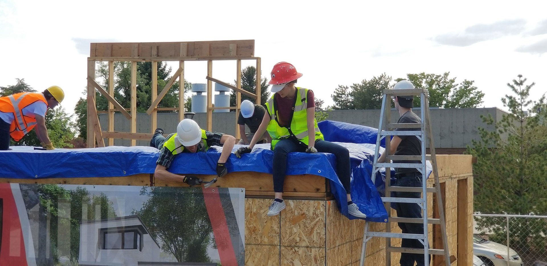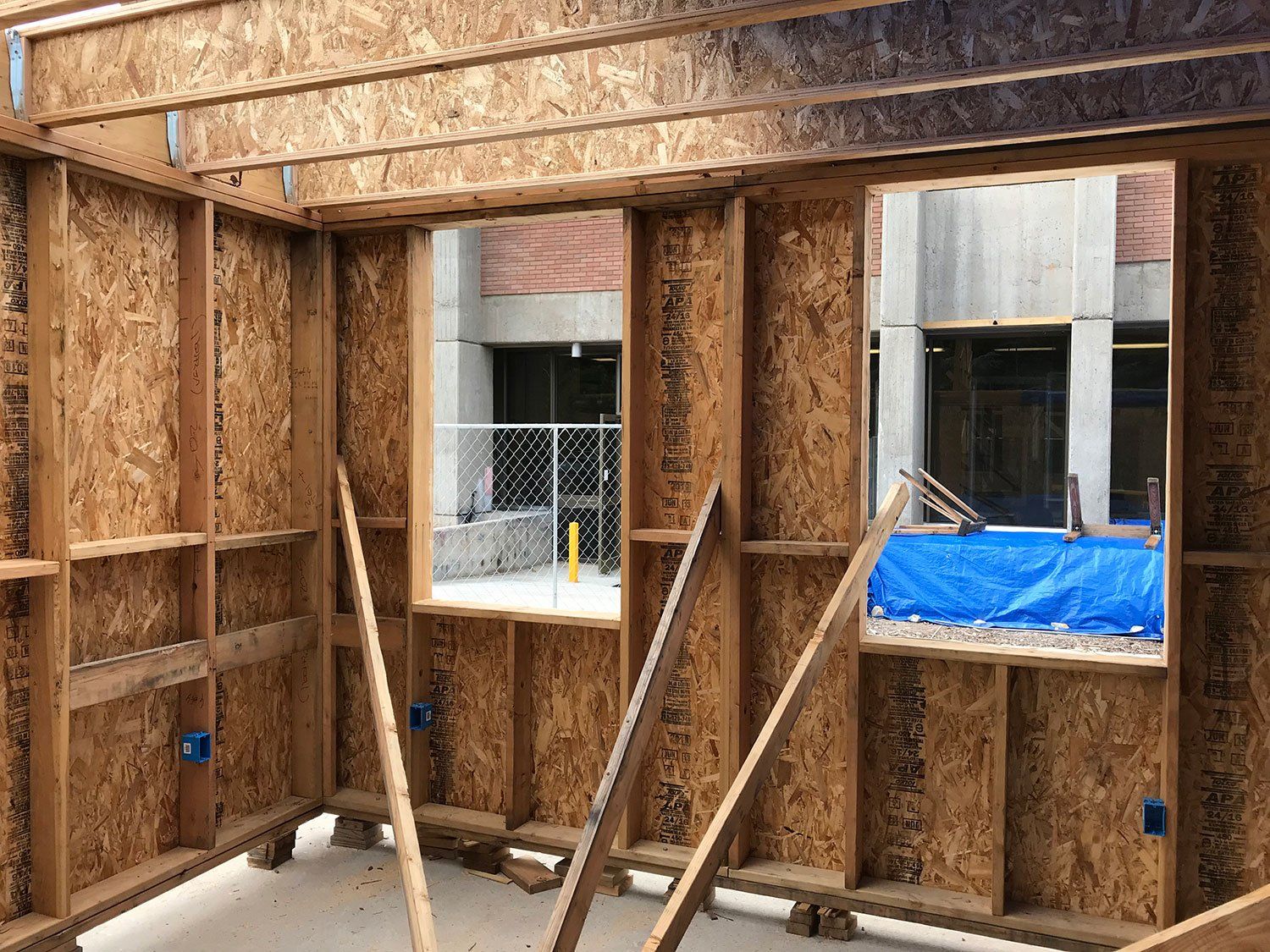 At our temporary campus construction site this week we continued pushing forward and things are moving at a great pace! Or building gets stronger each and every day, especially this week as we are adding sheathing to our panels. It's a bit tricky to make sure our panels stay separated and that we don't attach them together completely until we move them to site. We've nearly finished the lower level sheathing and the form of our building is continuing to be defined. Our roof joists and sheathing also made great progress this week. We've got a real house here! It's turning out so well, we are all ready to move in ourselves.