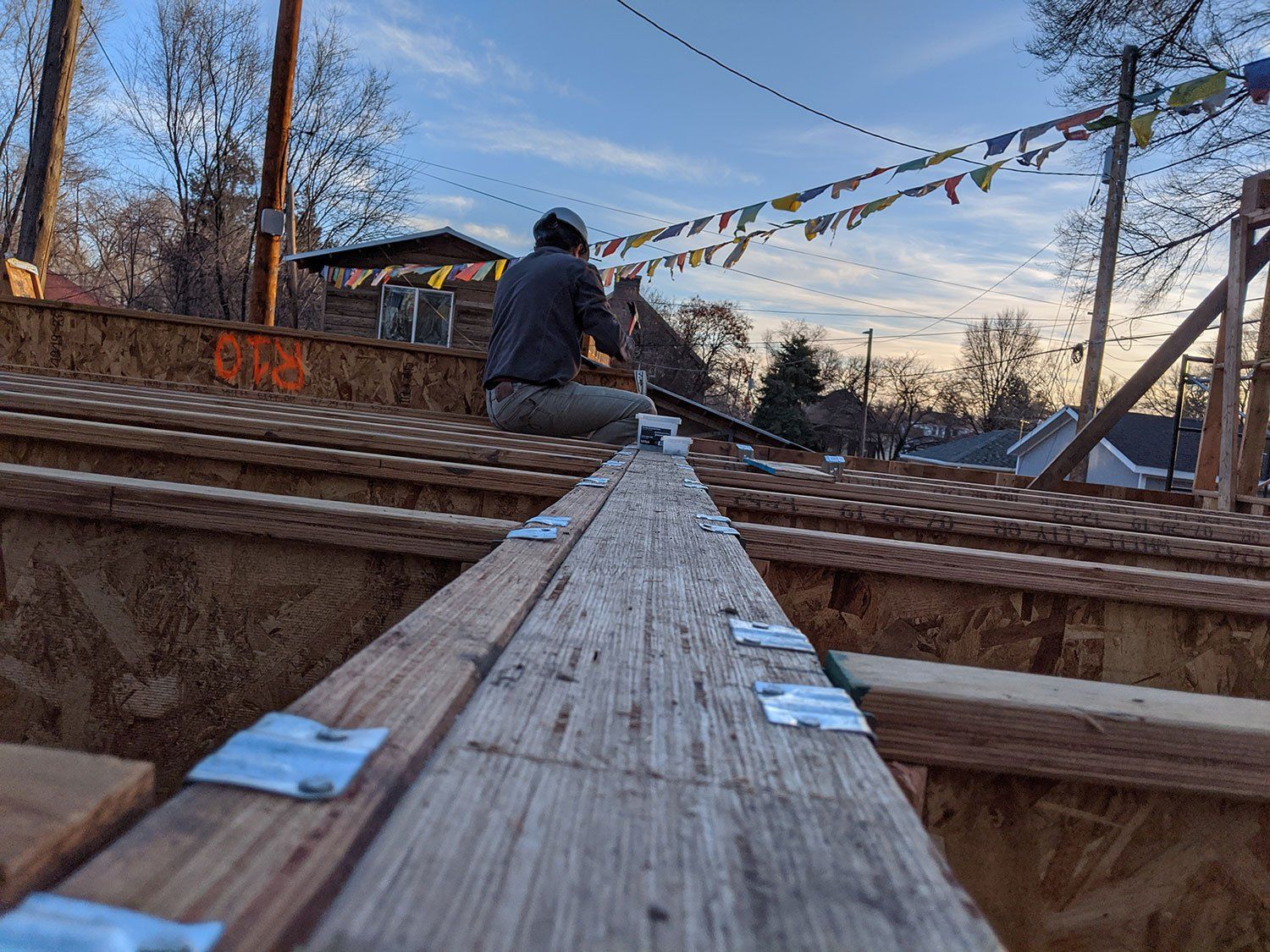 With everything securely fastened together, we continued on with our reassembly of what we built on campus. We were able to get in all of the first level joists and sheathing which allowed us to add a couple of new wall panels to our upper storage level. Every day gets us one step closer to a finished home!