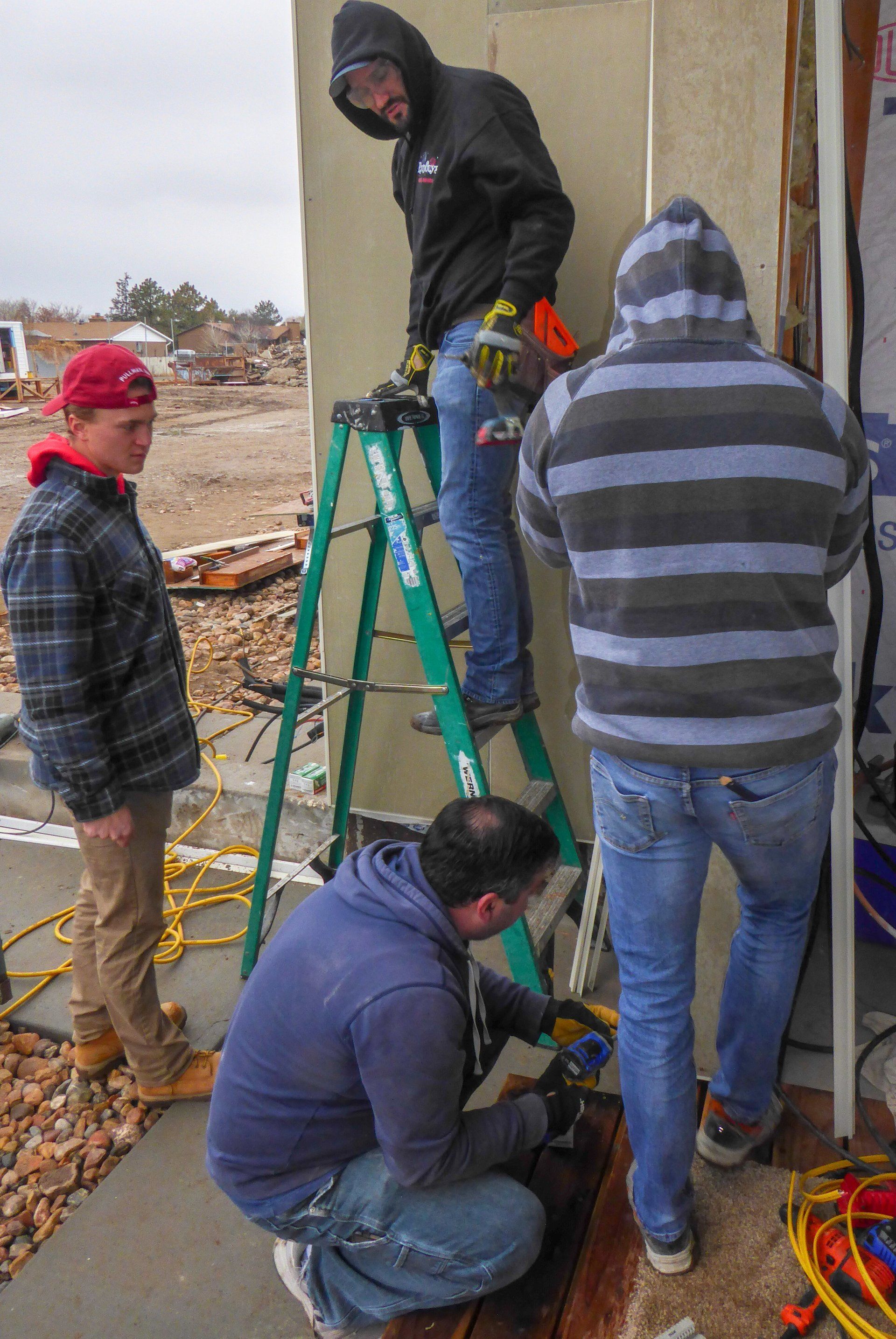 Today, we worked on the exterior cement board on the south side of the Units. Most of us spent the morning putting trim pieces on (they took a few weeks to order in) and cutting cement board. I think most of us are now pretty comfortable with the process of putting cement board on and we have definitely become more efficient. It is still a very long and tedious process to cover the house with it, but at least we sort of know what we are doing. David worked on some electrical fixture installations and had help from Zach and Joe.
