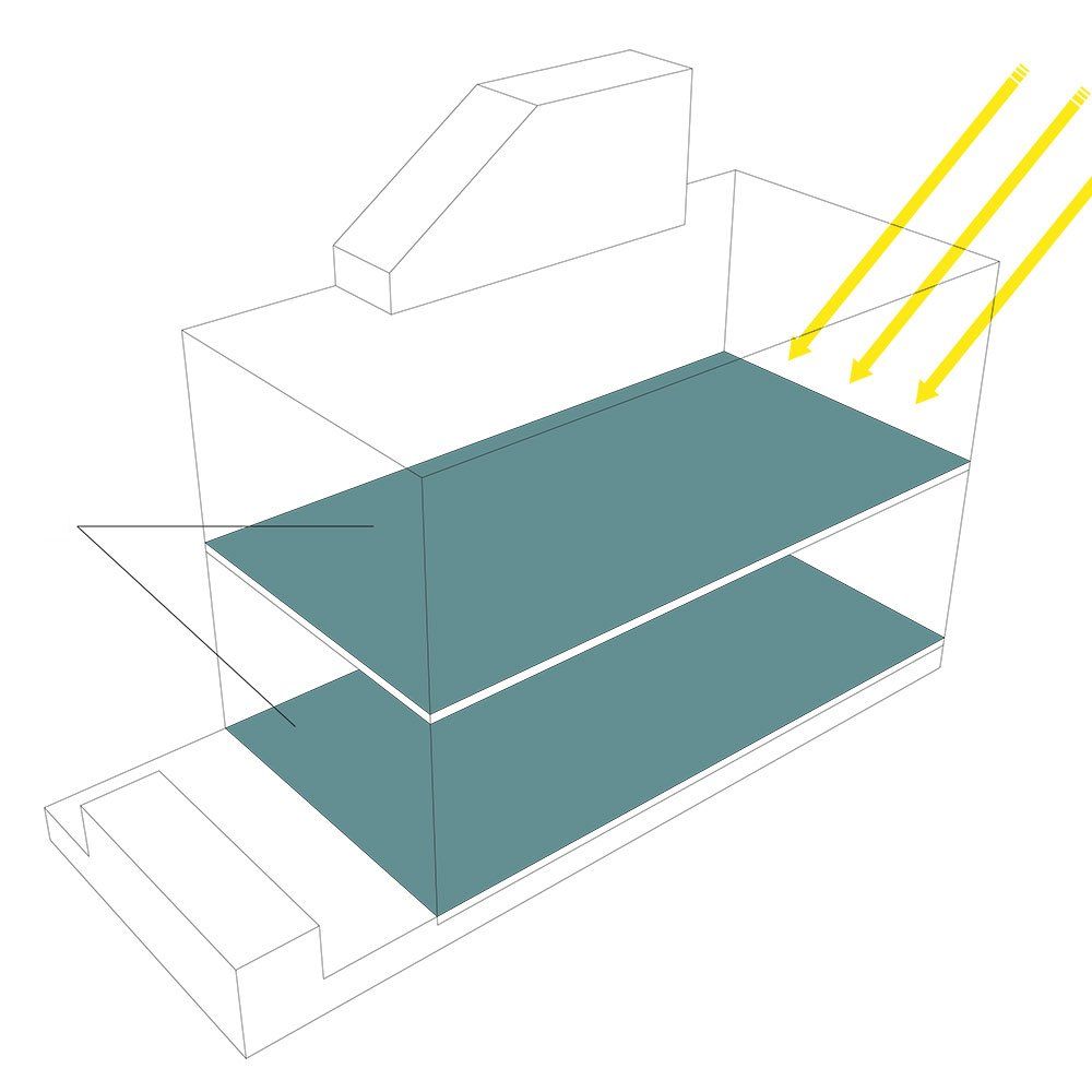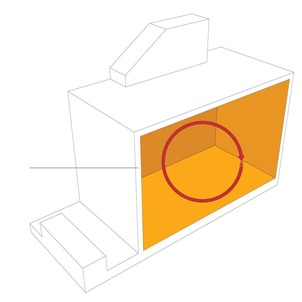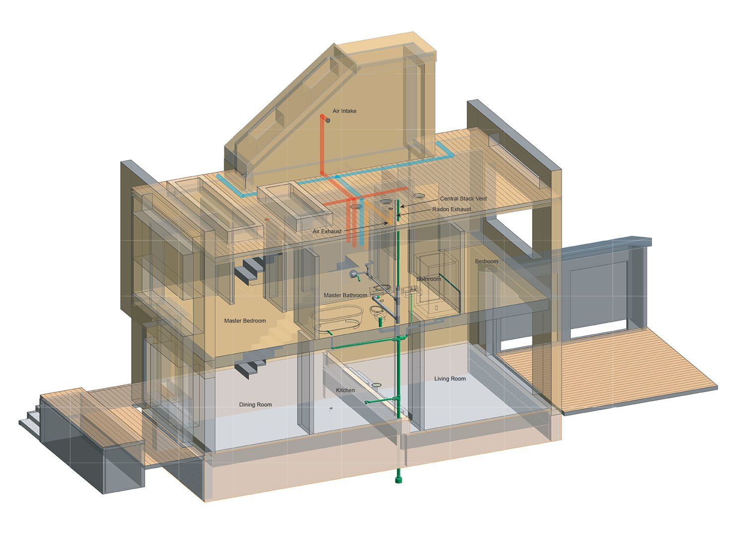 [X:14] is designed to the strict German Passive House standard, allowing the home to consume approximately 85 percent less energy per annum then a typical code standard home in the same location. This is achieved through a highly insulated and extremely airtight enclosure, which is constructed of 8 1/2" Structurally Insulated Panels (SIPs) that are infused with graphite. The high R-value insulation extends into the triple pane, argon filled window units that help retain the building’s heat or cold, depending on the specific season. Window sizing and orientation have been precisely designed to capture and retain the sun’s energy in the winter months and block unwanted heat gain in the summer. This thermal sealing of the house allows for greatly reduced mechanical systems and energy consumption within the unit. The active systems for heating consisting only of a 95% efficient condensing natural gas on-demand hot water heater, which provides both hot water needed for the radiant heating system as well as domestic hot water in separated loops. An Energy Recovery Ventilator (ERV) is installed to provide extremely high indoor air quality, at the same time reducing overall heat losses by conditioning the incoming air with the heat of outgoing air. The open staircase, in tandem with operable skylights in the stair hood on the rooftop and an operable window behind the wooden façade screen to the north, provide natural nighttime ventilation during the warm summer months, to reduce AC equipment sizing as well as loads. For visual comfort and backup heating, the design team proposes a direct-vent natural gas fireplace that is located in the center of the open main floor, to act as a place to gather around.