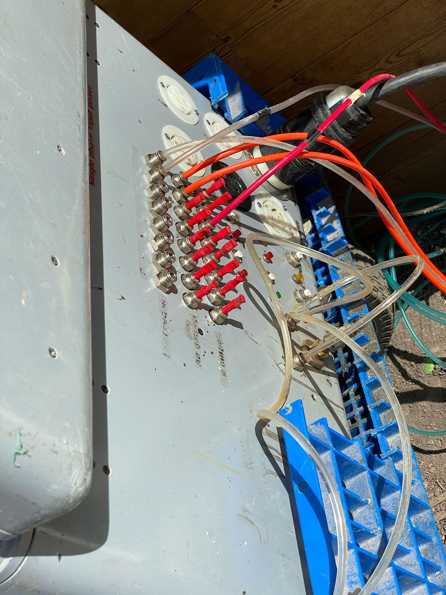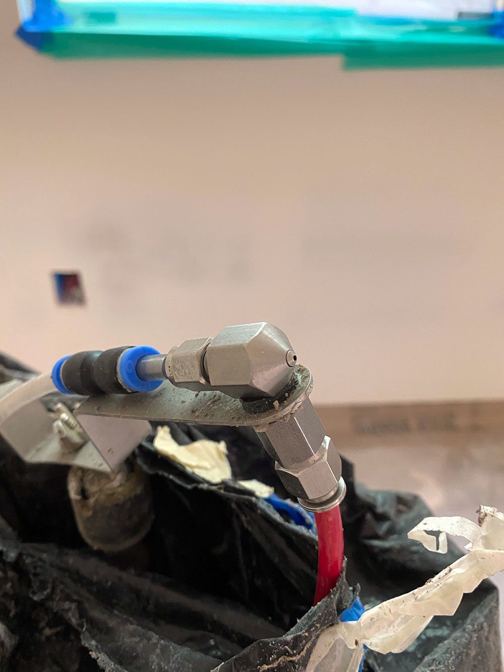 To get to our desired air infiltration goal, we hired Aero Barrier West to install this new high-performance building system. During the process, the building is taped shut and set under 100 pascals positive pressure, when a liquid gasket is sprayed into the building under very high pressure, creating tiny aerosol particles that start to clog all areas of high wind velocity - these are all the gaps and cracks that are remaining in a building. At the beginning of the process, we started at a 2.5 ACH50, which was different from the previous test because we forgot to close shut one of the upper windows. After this issue was fixed, the team was down to 1.7 ACH50, and the computer could tell us that we had a sum of leaks of 22 square inches.