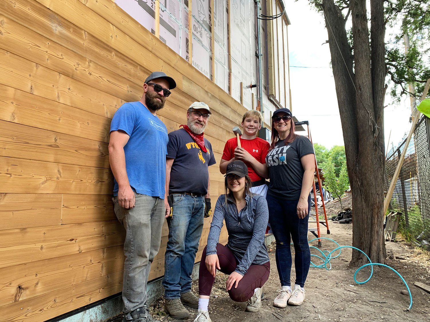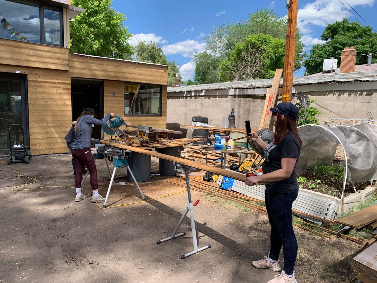 Volunteers at work, cutting the siding cedar boards to lengths.