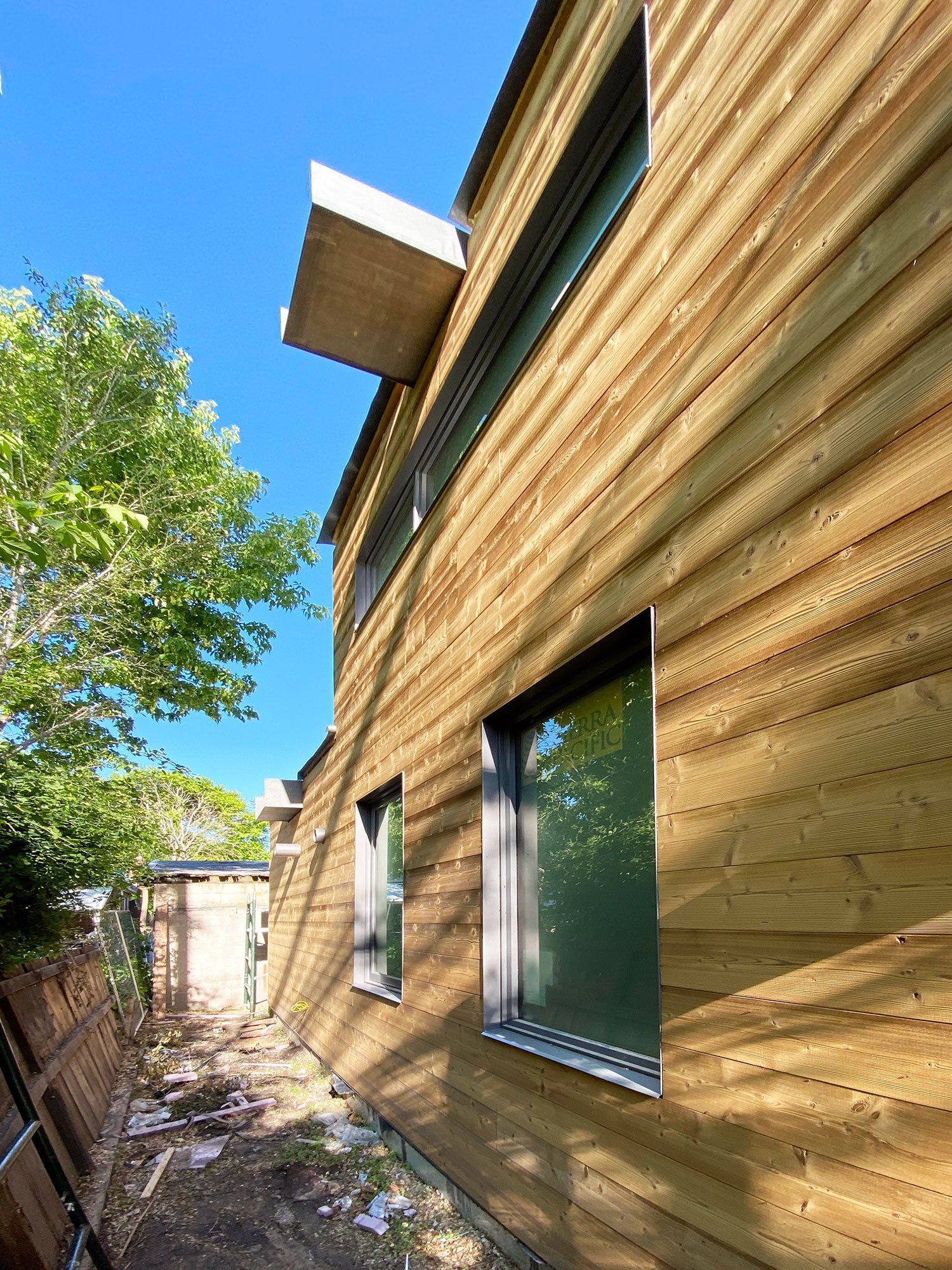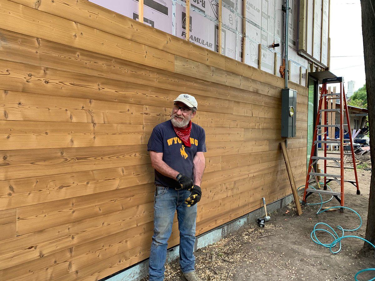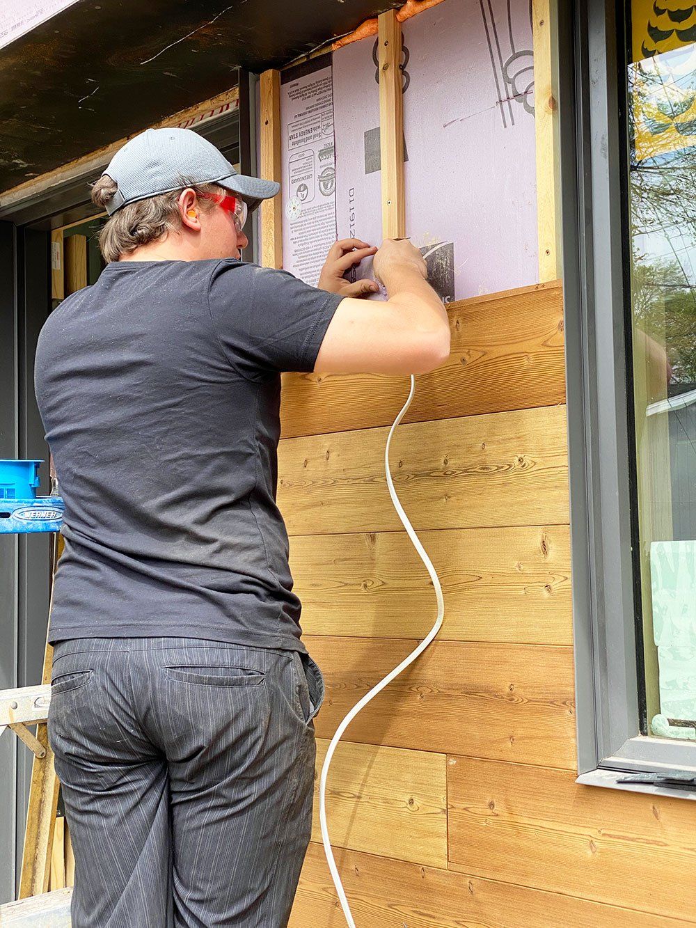 Starting with the bottom board (which needs to be carefully nailed to the substructure because the nails on the lowest siding is visible), each board gets added and adjusted to the metal frames around the windows, light cans, penetrations or ERV ducts.