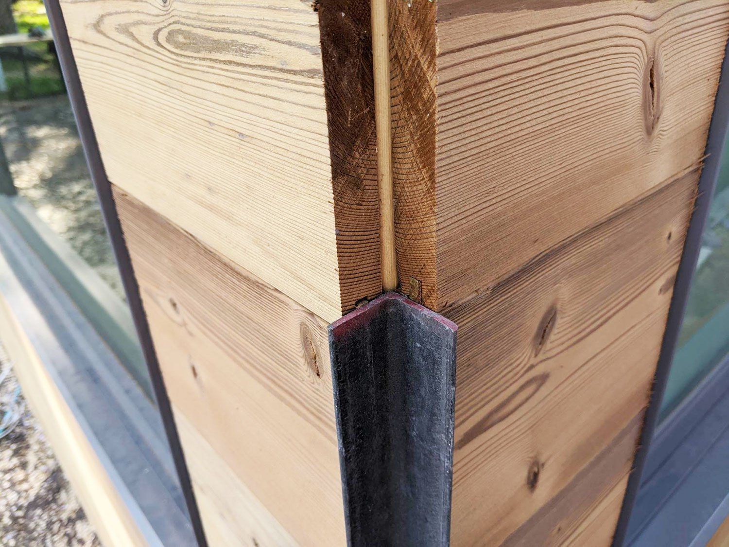 The detail for the corner will be a 1x1" milled steel L-profile that will age and match the character of the facade boards as well as the sun blades installed throughout. It also allows for a simple element to be installed, rather than cutting all corner boards at a 45 degree angle.