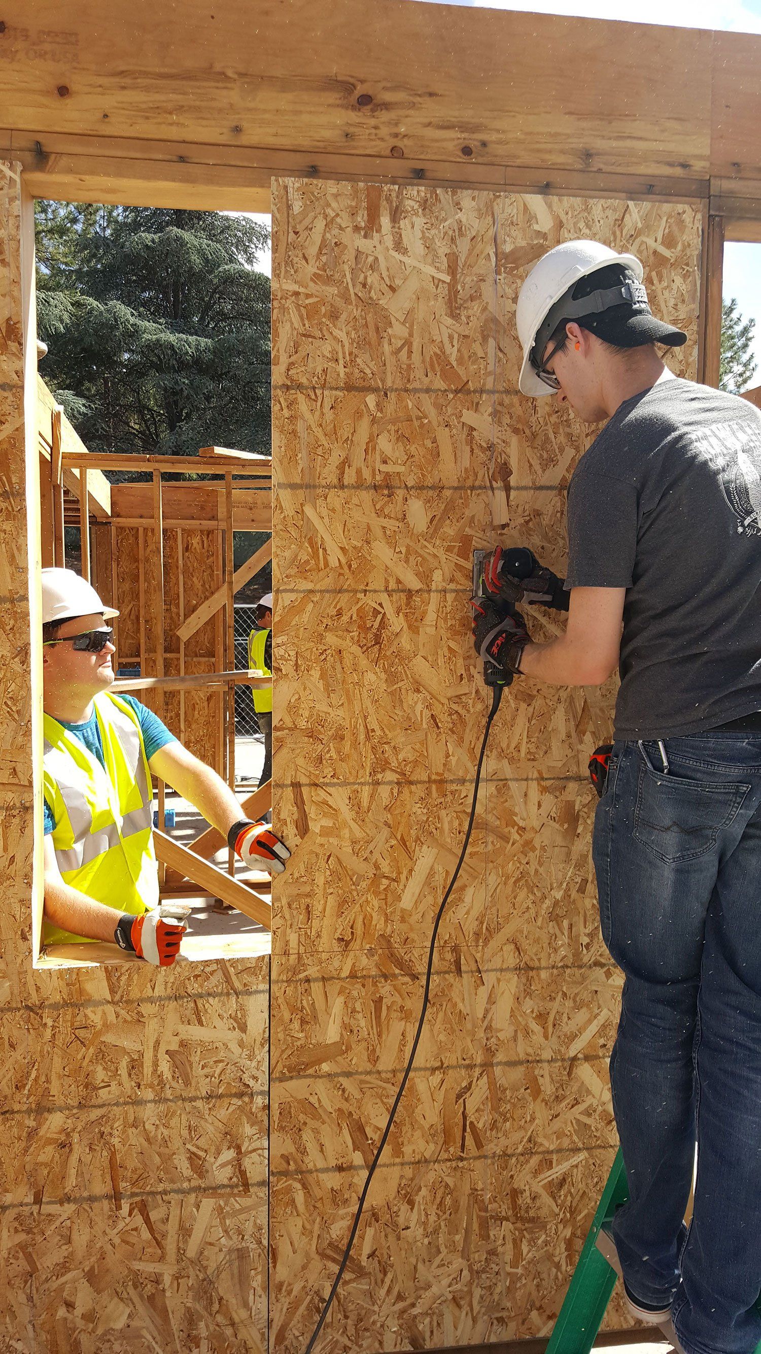 At our temporary campus construction site this week we continued pushing forward and things are moving at a great pace! Or building gets stronger each and every day, especially this week as we are adding sheathing to our panels. It's a bit tricky to make sure our panels stay separated and that we don't attach them together completely until we move them to site. We've nearly finished the lower level sheathing and the form of our building is continuing to be defined. Our roof joists and sheathing also made great progress this week. We've got a real house here! It's turning out so well, we are all ready to move in ourselves.