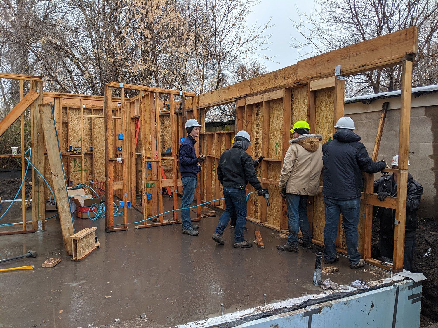 With our concrete foundation cured and the holiday weekend over, we got to work this week reassembling the panels we built on campus as well as insulating and back-filling the slab.