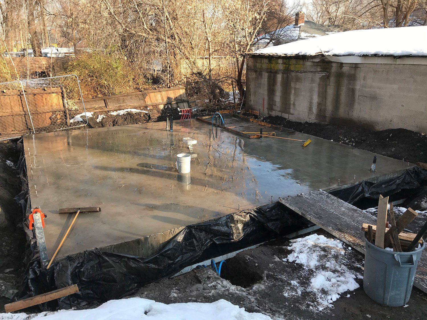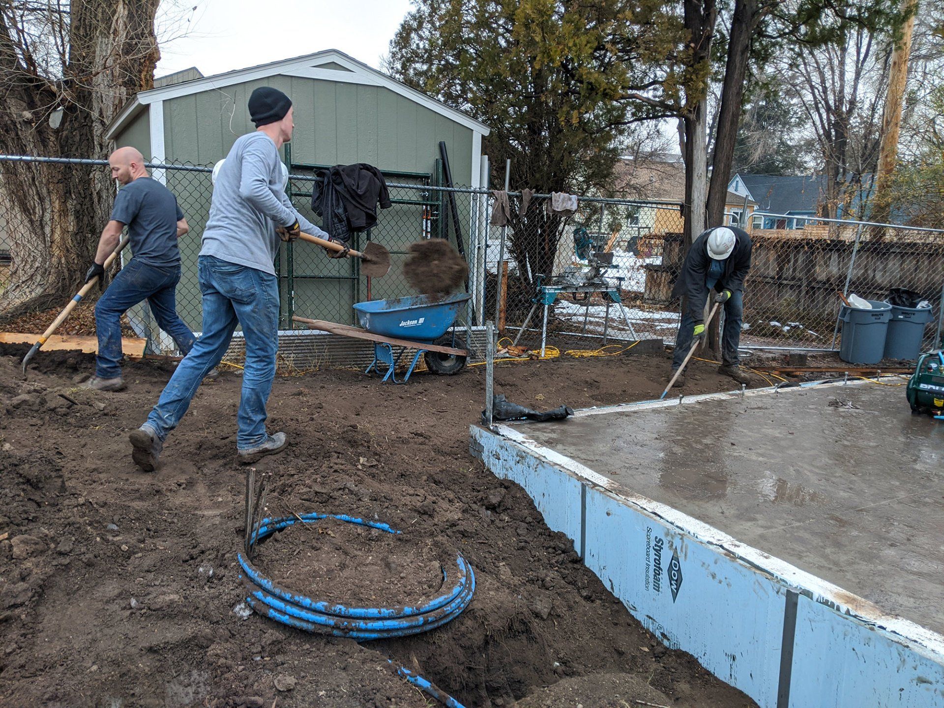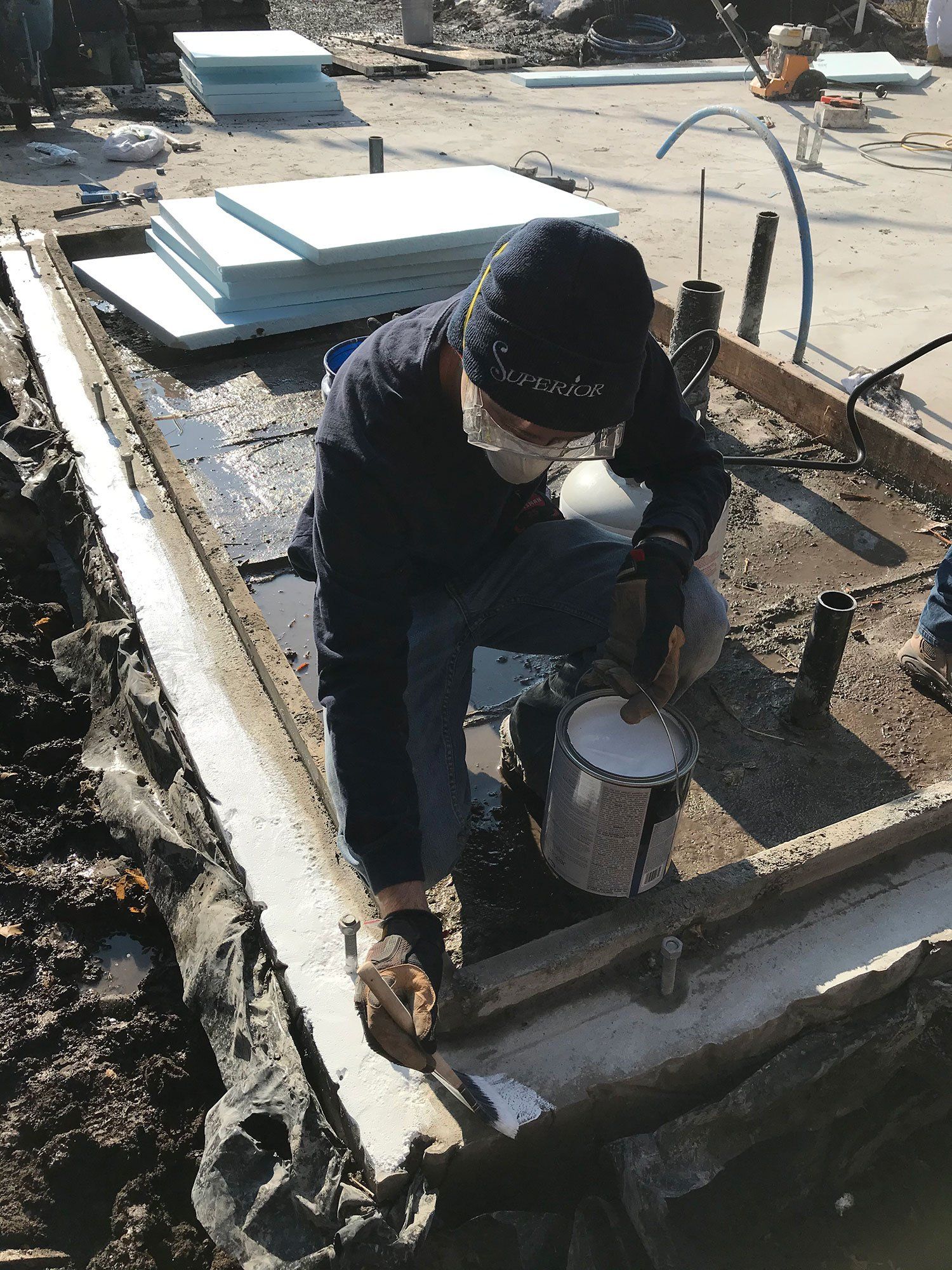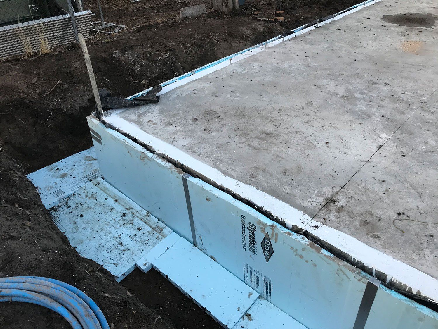 It was so awesome to come back today and see our concrete foundation all ready to go! We've spent weeks getting ready for this and now it looks fantastic. There was more work to go on the slab however, including insulating the edges of the slab where the form work had been. Once that inspection was complete we were able to backfill the dirt against the foundation which made our construction site much easier to navigate.