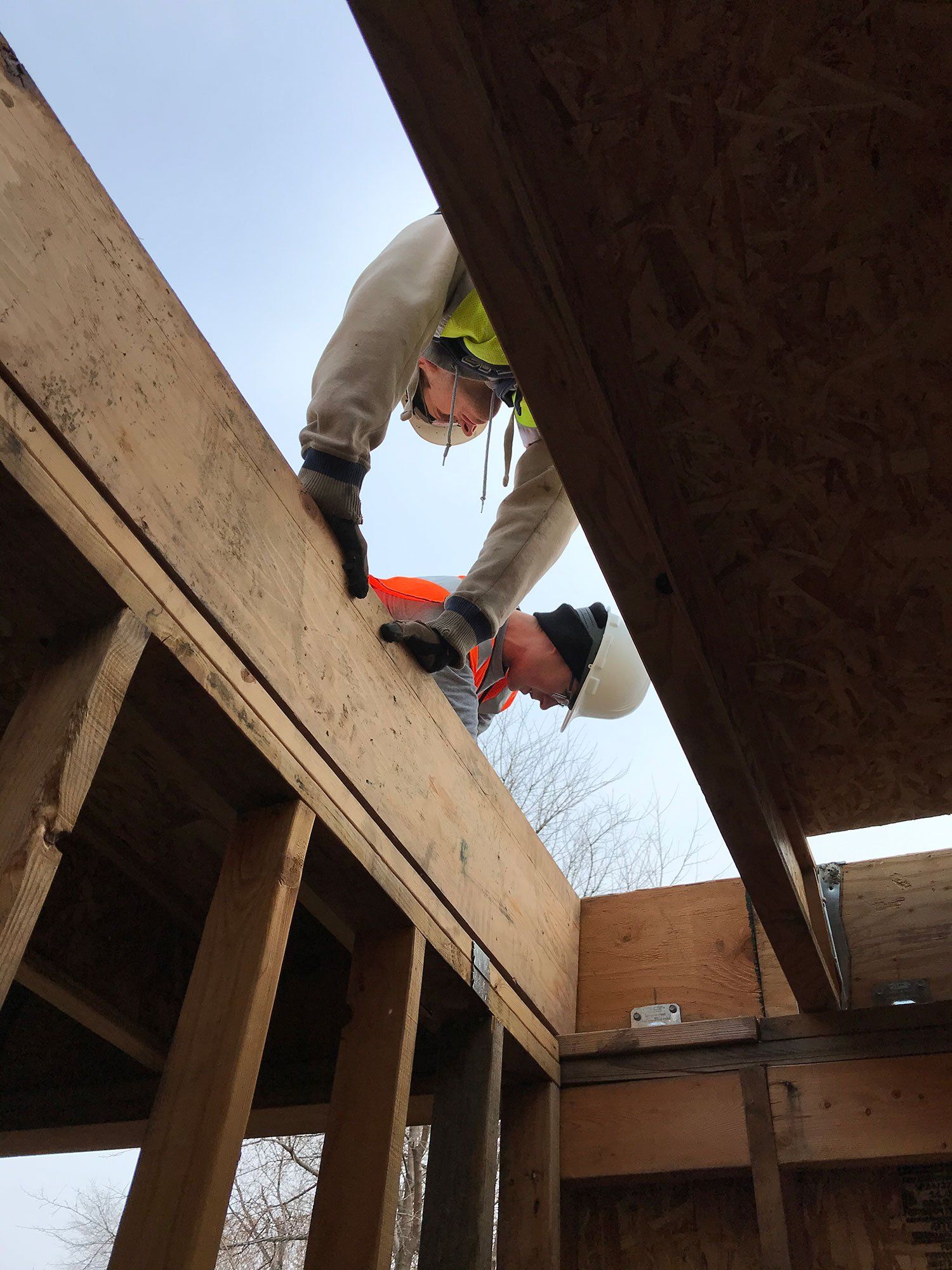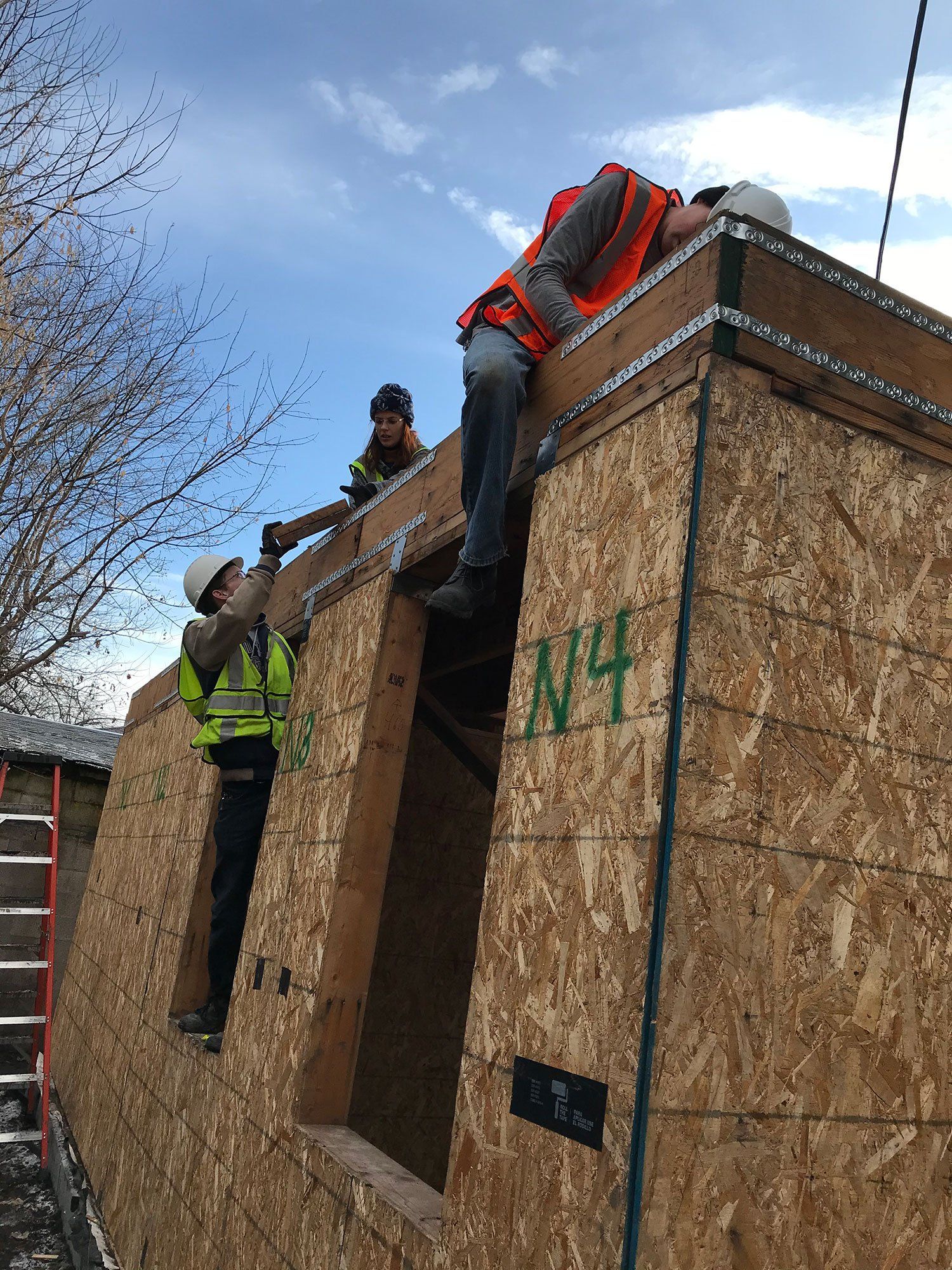 With everything securely fastened together, we continued on with our reassembly of what we built on campus. We were able to get in all of the first level joists and sheathing which allowed us to add a couple of new wall panels to our upper storage level. Every day gets us one step closer to a finished home!