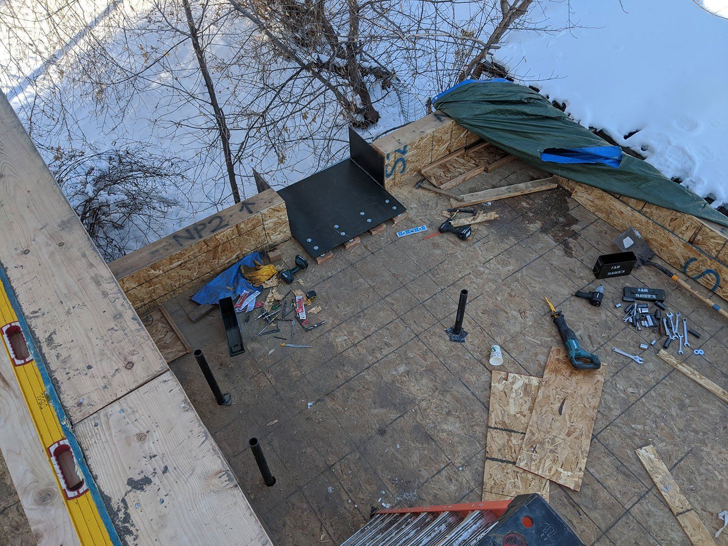 This pre-inspection gave us also the go ahead to move forward with our roof and to begin taping our sheathing for air-tightness. Part of our design for the roof are our metal scuppers. We built those last semester to waterfall