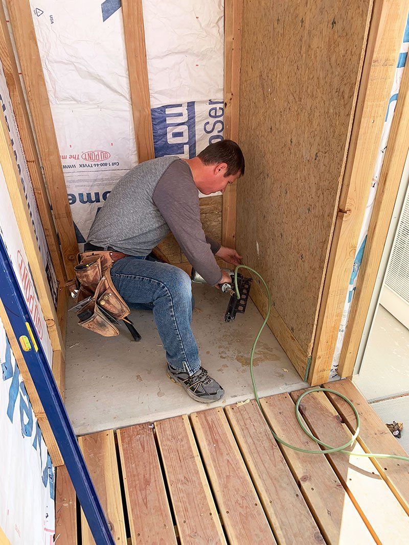 While working on hardie board located around the back deck, we first had to install more mounting studs to which we could then install plywood, after that we had to wait for more tyvex house wrap to arrive so we could cover the plywood with it. Then 2x4 studs were nailed down, this was for the hardie board to be attach too. Some of us spent time installing the studs that were still missing around the house.