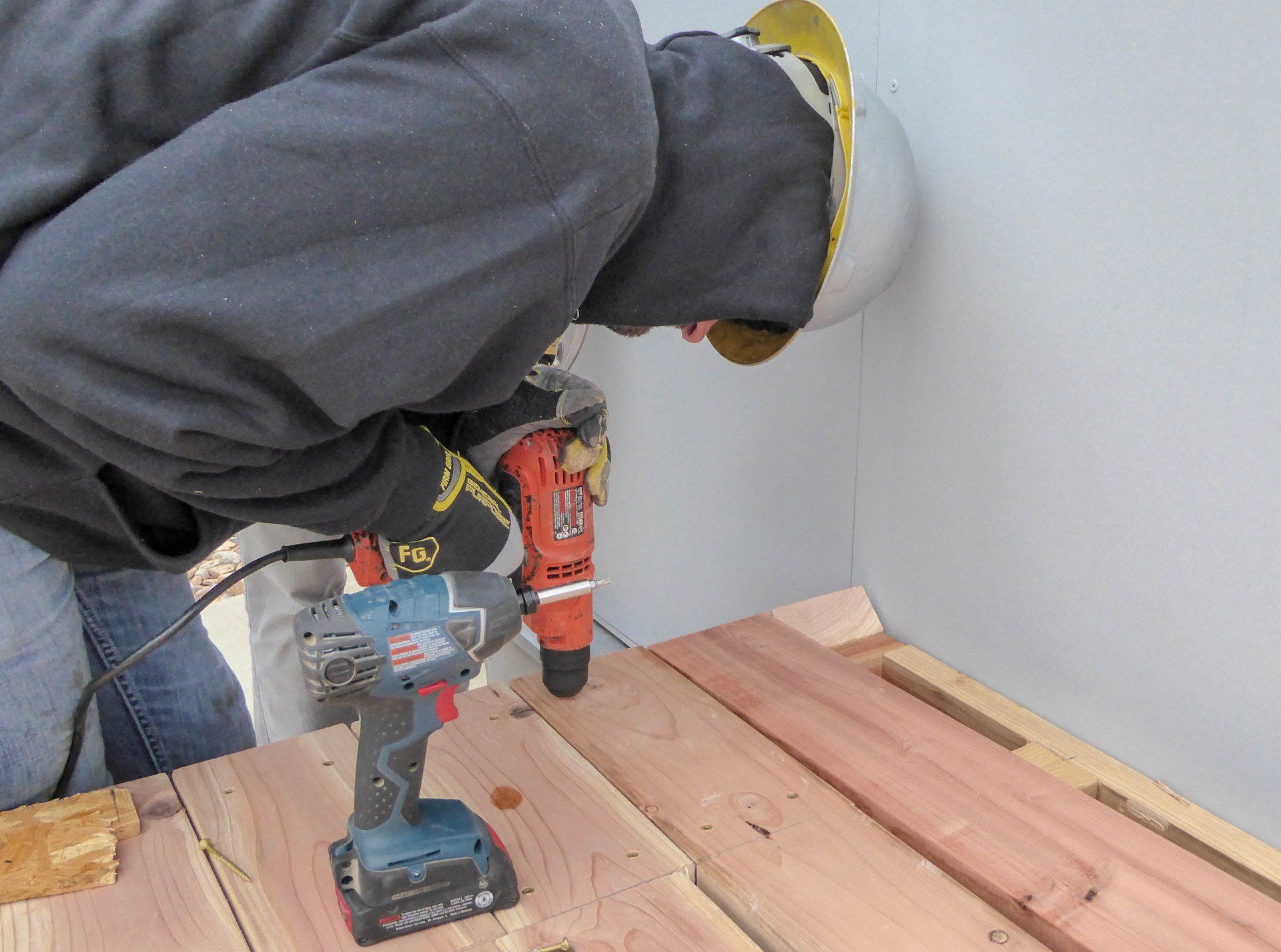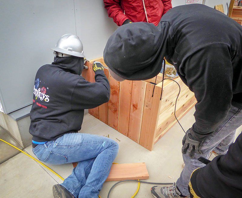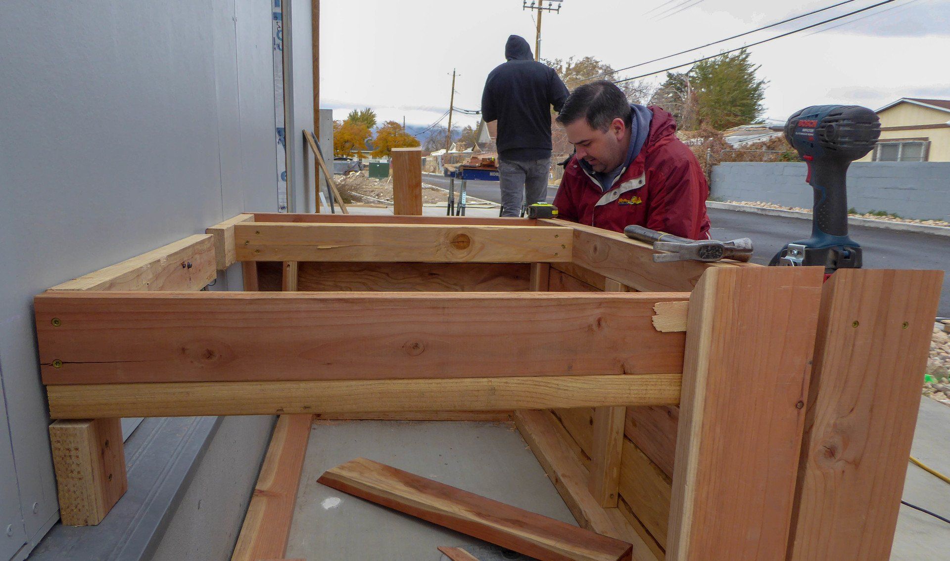 We definitely felt the change in temperature as the weather turns colder and we experienced the need for jackets today. We split up into two team today. Scot, Daniel, Andy, Chris, and Joe worked on finishing the exterior redwood box in front of Unit 10. This particular box was a little more difficult than the first because it was initially built by others and needed to be squared up and plumbed more accurately. After spending some time on correcting the frame, we were able to complete the box including the hinged lid.