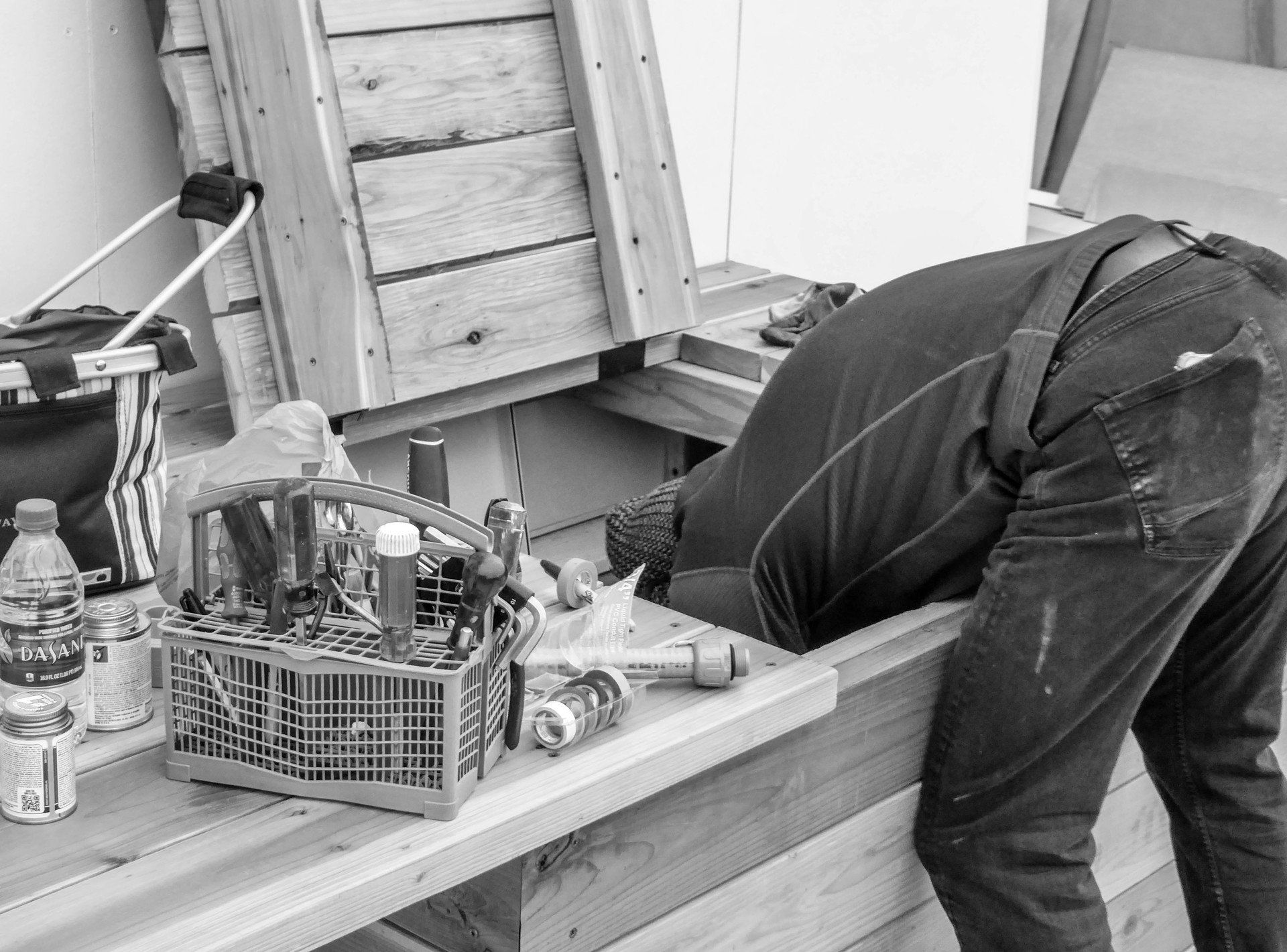 This week was mainly about finishing the exterior front porch benches, reconfiguring the kitchens due to a construction configuration that ignored the original kitchen design, and other finishing work inside the units. We also did a third and final Blower Door test.