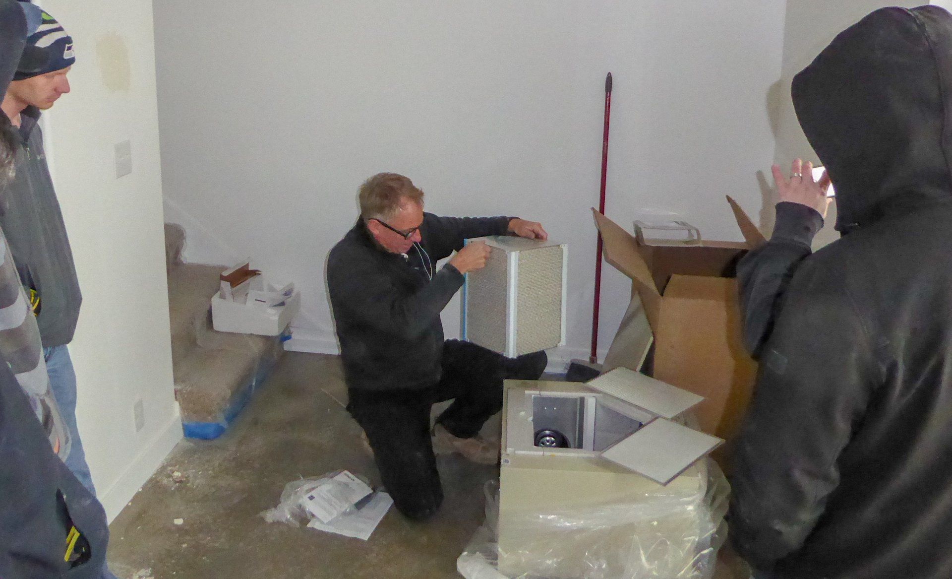 Tuesday, November 27th was a cold and wet day, the ground was extremely muddy and this made it difficult to move tools, to and from the storage container located on the other side of the property. Lucky for us, the general contractor had plenty of work to be done inside. And while he gave us the option of working on the new unit next door, most of us were just fine staying inside were it was warm. One especially nice development was the radiant floor heating was turned on, this was extremely nice and worked very well.